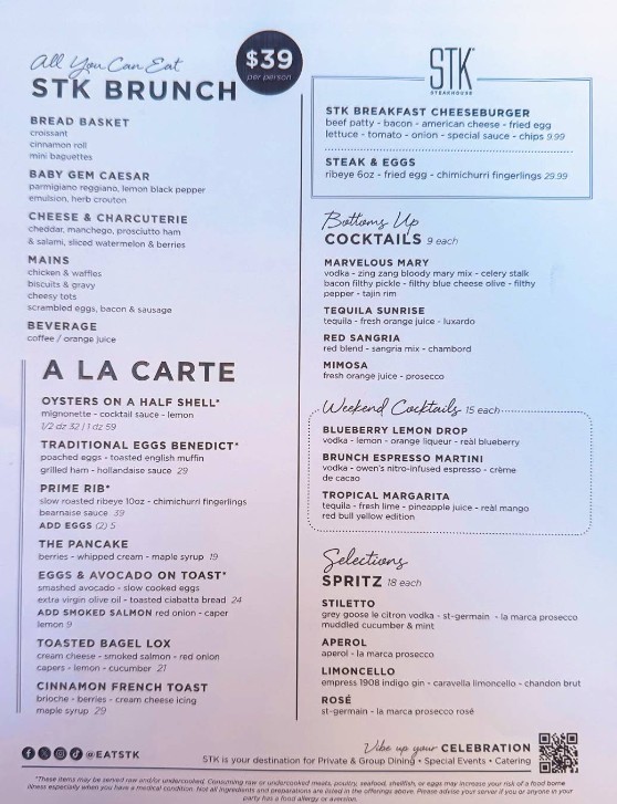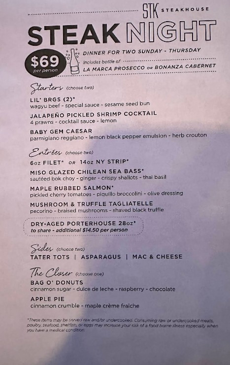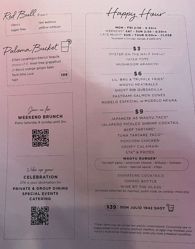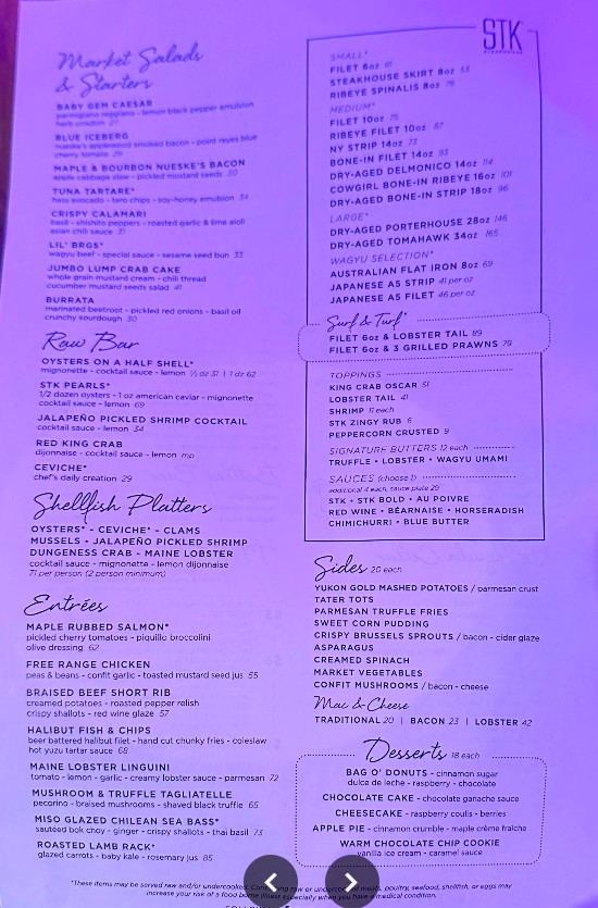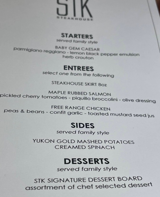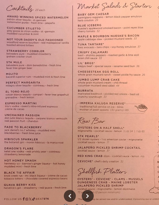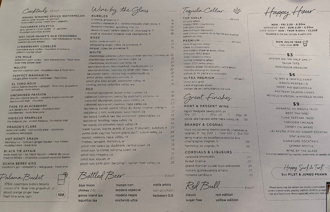 Welcome to the official menu page for STK Steakhouse Restaurant! Renowned globally for its high-energy atmosphere and innovative take on the classic American steakhouse, STK offers an unparalleled "Vibe Dining" experience. Here, you can explore the complete STK Steakhouse Restaurant menu, featuring our exclusive cuts of beef, stunning raw bar selections, mouth-watering sides, and expertly crafted cocktails. Whether you're planning a romantic dinner or a celebratory night out, browse the latest prices and discover the menu items that make STK a luxury dining destination.